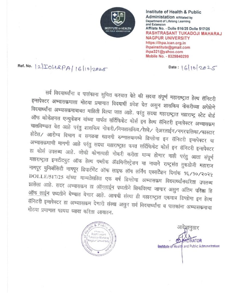 स्वच्छता निरीक्षक अभ्यासक्रमाच्या नावाखाली विद्यार्थ्यांची दिशाभूल होण्याची शक्यता